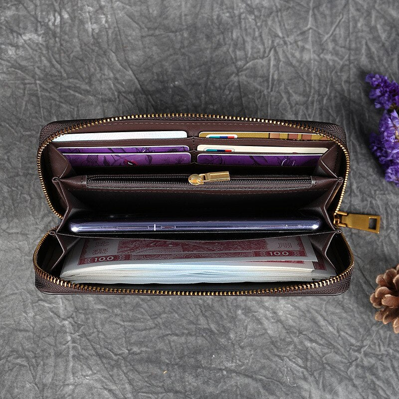 Long Bags Women Clutch Leather Embossed Zippered Purse Vintage Ethnic Style Purse